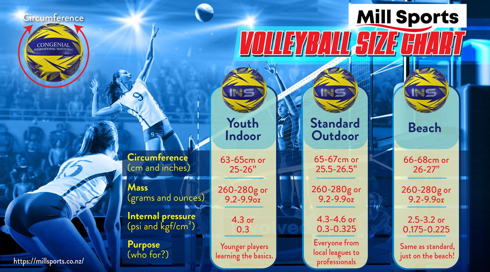 The official volleyball size and weight for an indoor ball (or Size 5 Volleyball) lands at a circumference of 65-67cm and 260-280grams, while its psi will land somewhere between 4.3-4.6. While these differences may seem insignificant when compared to youth balls, they can have a huge impact on gameplay.