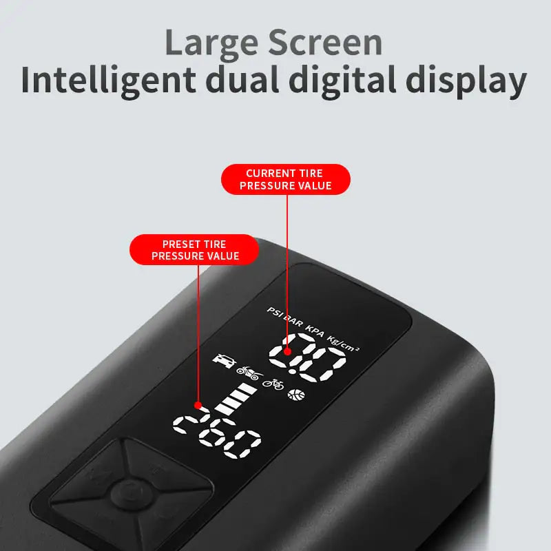 Simple and efficient, this compressor boasts user-friendly operation. With just a flick of the switch and an LED indicator-guided preset pressure adjustment, you can inflate your tires swiftly and accurately. Plus, its cordless design ensures hassle-free portability, perfect for on-the-go adventures like camping trips and outdoor escapades.
