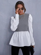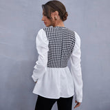 Crafted with meticulous attention to detail, the vintage plaid patchwork design exudes an air of timeless sophistication, while the ruffled detailing adds a touch of graceful elegance. The puff sleeves are not just trendy, they're a fashion-forward feature that adds flair to any outfit. And let's not forget about the flattering o-neck neckline, designed to accentuate your neckline and add a chic touch to your ensemble.