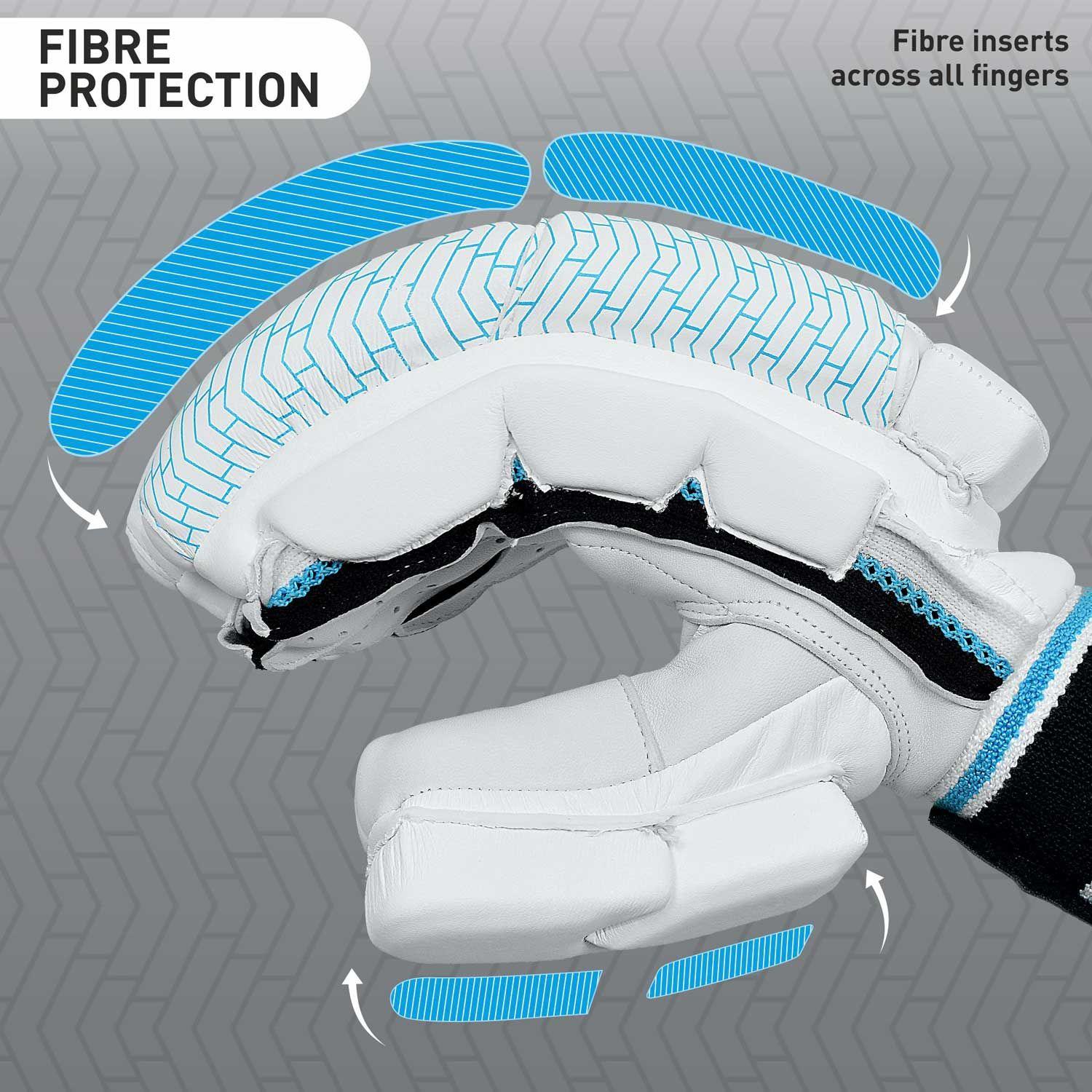 Features: - Thermoplastic PU insert in two lead fingersヨ High impact protection| Reinforced Fibre inserts in other fingers |Three sidebars in the lead hand | Airflow gusset for ventilation and comfort | Soft fill lining for protection and comfort| High-density foam and Split Thumb for better protection | Additional leather patch on hard-hitting areas | Elasticated wristband with Velcro fastening | Greater flexibility and grip with two split fingers.